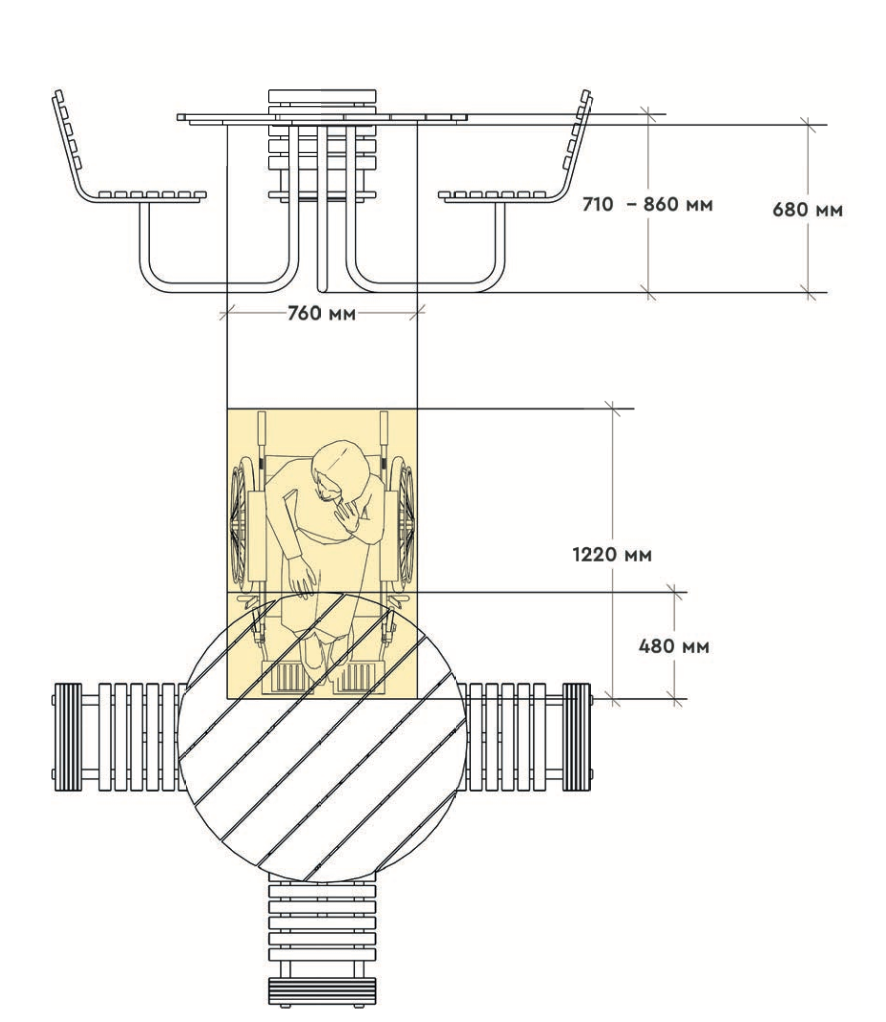 Для МГН предусматривается проход между столиками ≥ 1,2 м и зона разворота диаметром ≥ 1,5 м (при отсутствии сквозного прохода). При возвышении террасы оборудуется пандус шириной ≤ 1 м.